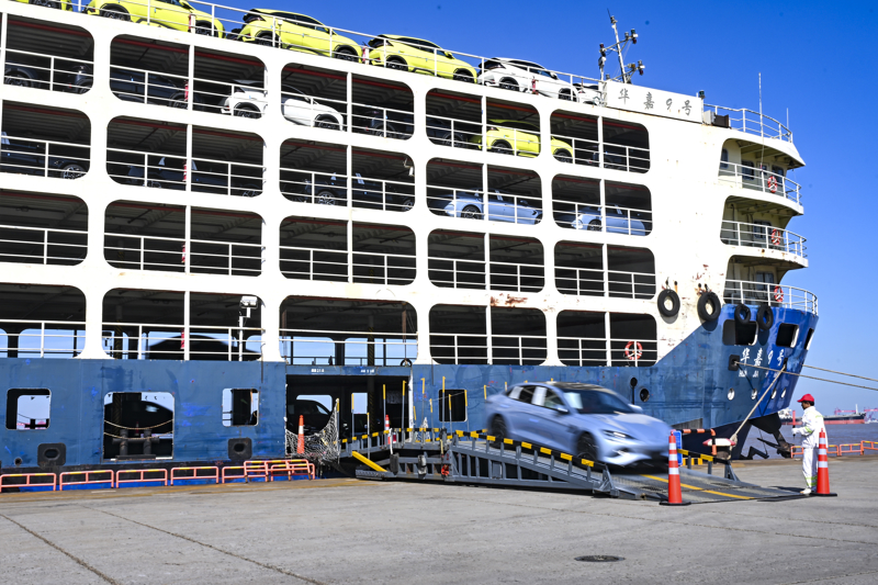 2025年9月,工作人员在外港海通码头将国产新车从滚装船上卸船,准备外运出口。上海外高桥港区是上海口岸进出口汽车数量最大的口岸,坐落于该港区的外港海通码头是目前全国最大的单一整车滚装码头。新华社记者 陈浩明 摄